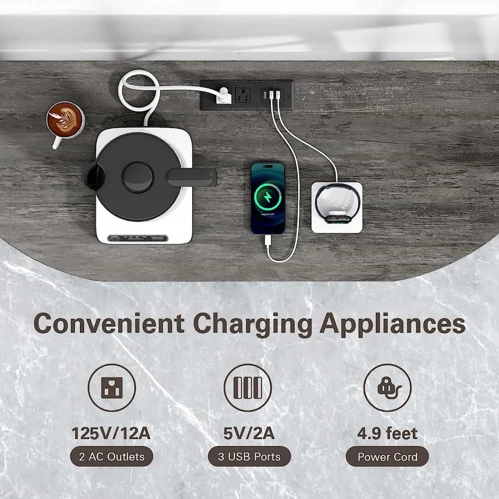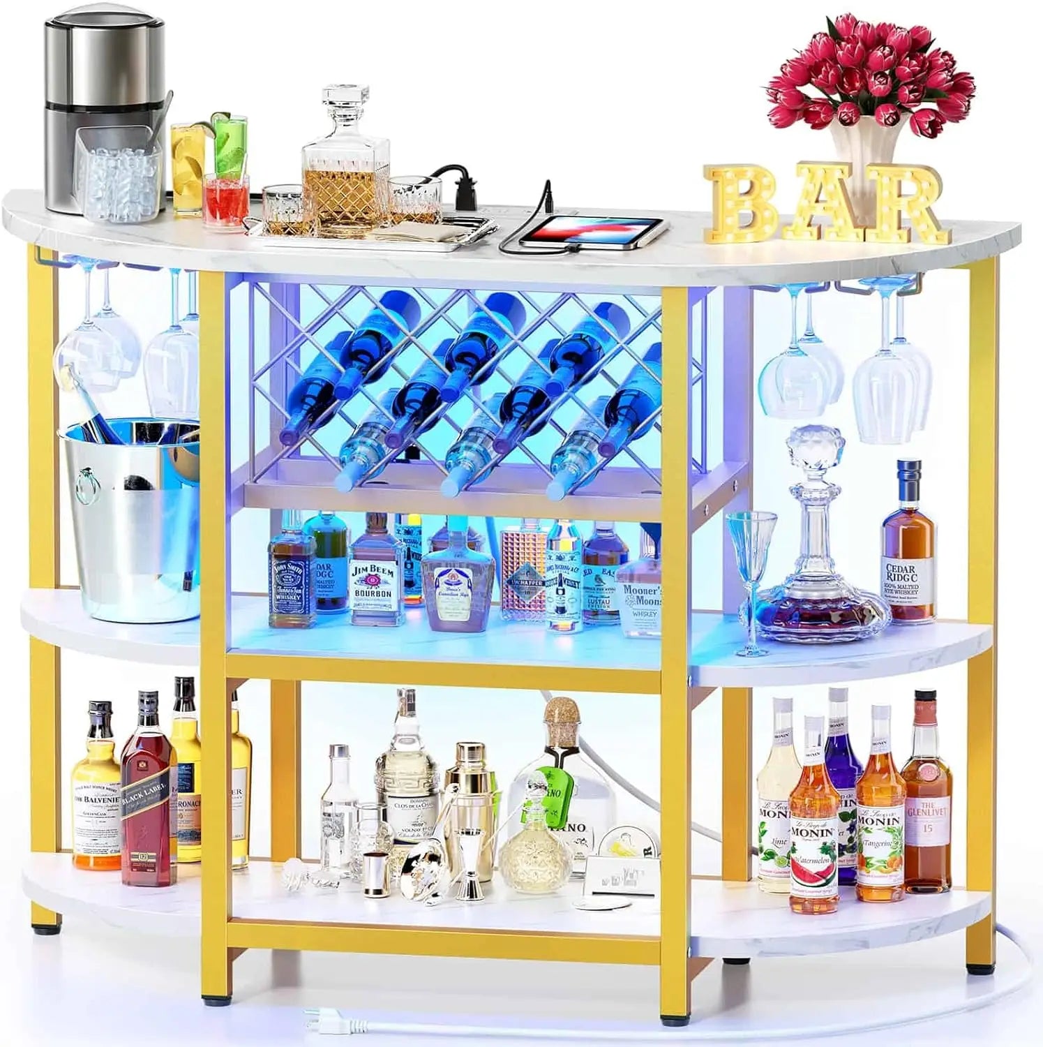 Bar Table Cabinet with Power Outlet, LED Home Mini Bar Cabinet for Liquor, Metal Wine Bar Stand with 4-Tier Storage