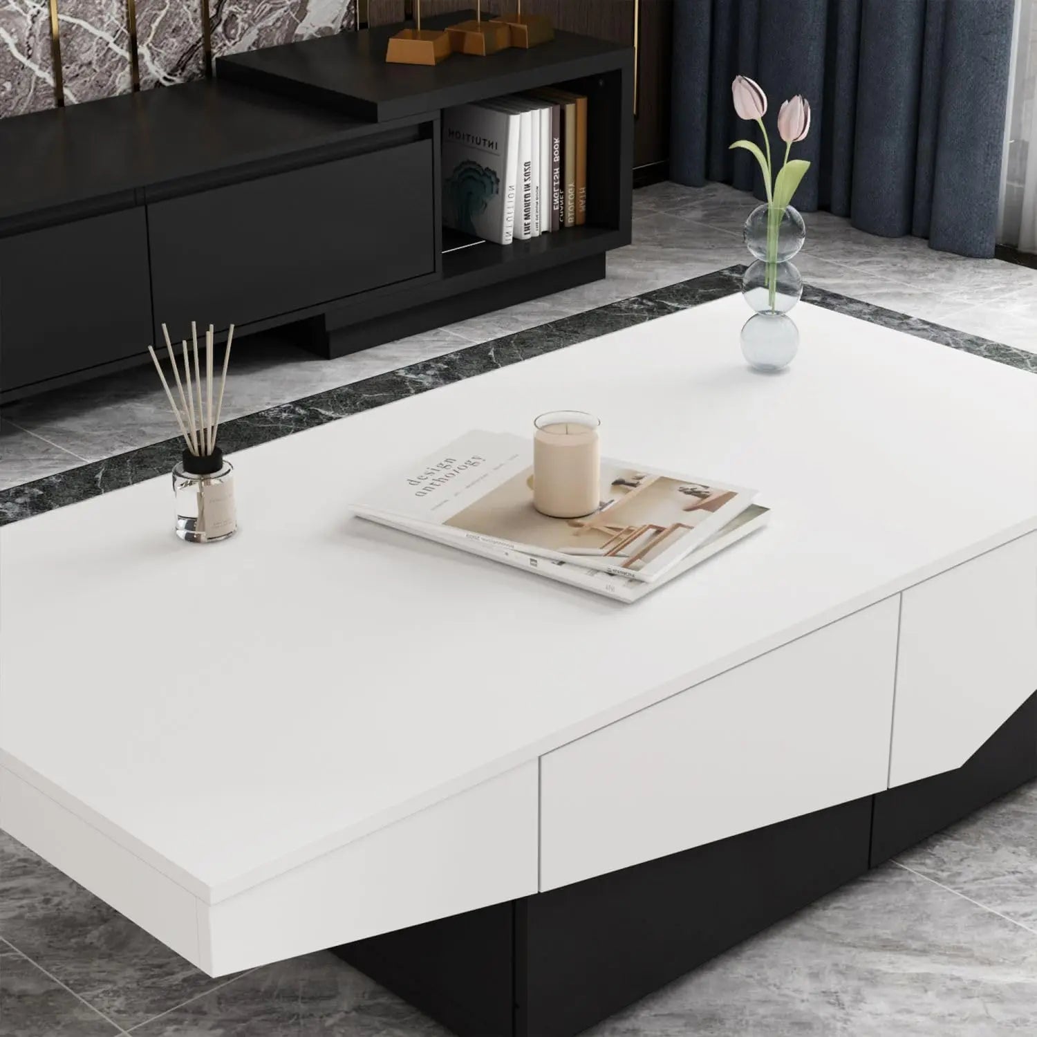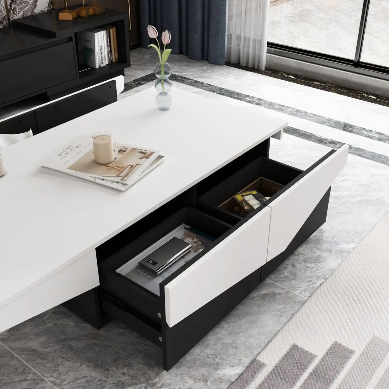 Modern Coffee Table with 4 Drawers, Central Table Living Room with Storage, White and Black Wood