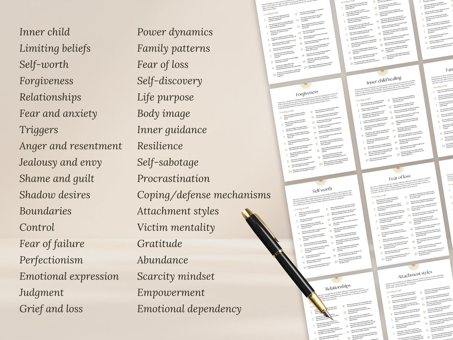 34 Healing Categories: Extensive sections covering Inner Child, Limiting Beliefs, Relationships, Fear & Anxiety, Triggers, and Self-Sabotage.